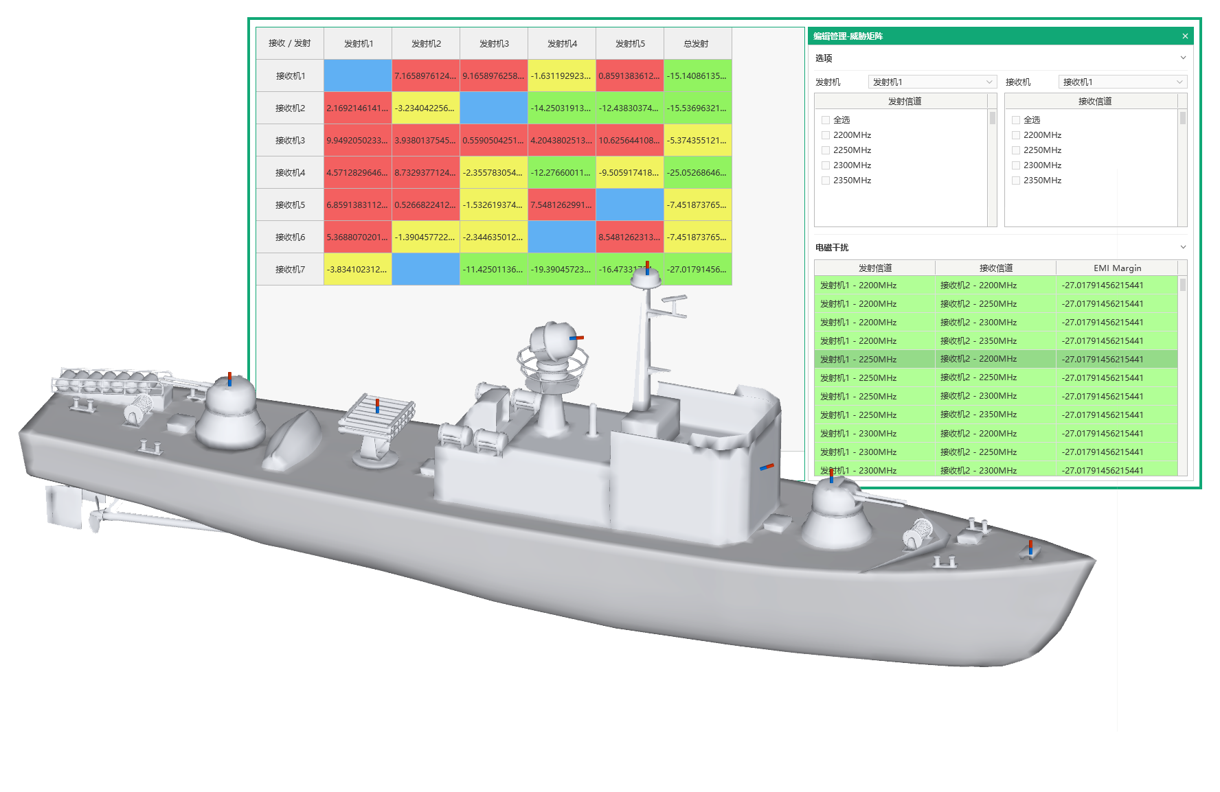 在现实通讯系统中,因为受到载体与环境因素的影响,天线的性能指标会发产生一定的变化。同时,天线之间也会产生互扰现象。定量评估这些变量,可为进一步的布局优化设计提供有效指导。RDScene系统布局软件支持系统性地预测平台对天线主要指标的影响以及多个无线收发系统的射频EMI干扰问题,以威胁矩阵的形式显示干扰信号的源头以及其到达接收器的路径,方便设计者快速评估各种EMI缓解措施,从而实现解决方案优化。